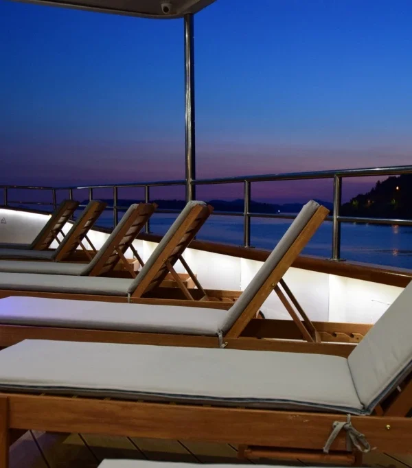 Das Schiff bietet ein intimes Ambiente für maximal 36 Gäste in 18 stilvollen, klimatisierten Kabinen (mit eigenem Bad, Safe, TV und täglichem Service).