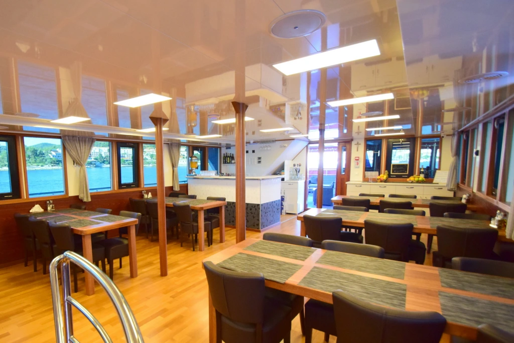 Allegemeine Daten: Länge 39 m, Baujahr 2017 und 2023 vollständig renoviert. 36 Betten in 18 Kabinen mit LCD-TV, Safe, Haarföhn, Dusche/WC und individuell regulierbarer Klimaanlage.