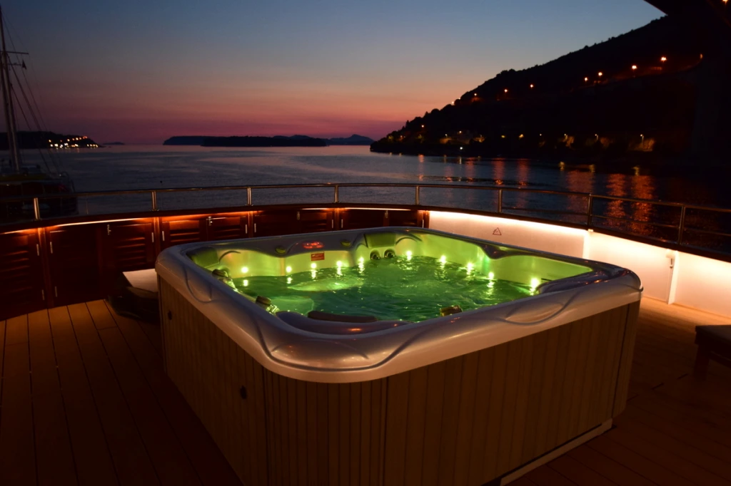 Geräumiges Sonnendeck mit Liegestühlen und einem Whirlpool.