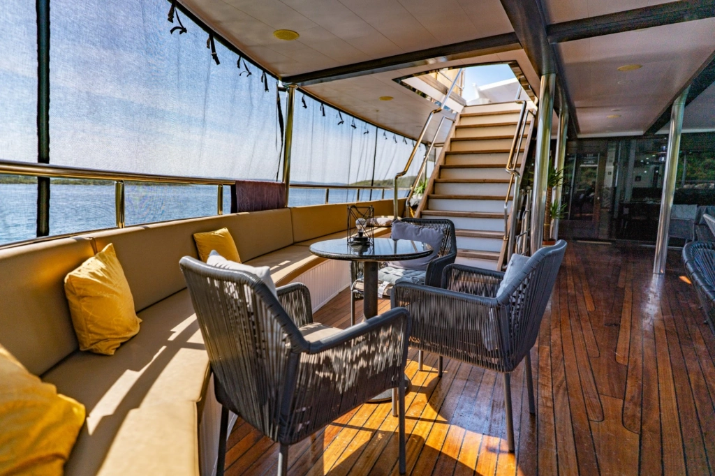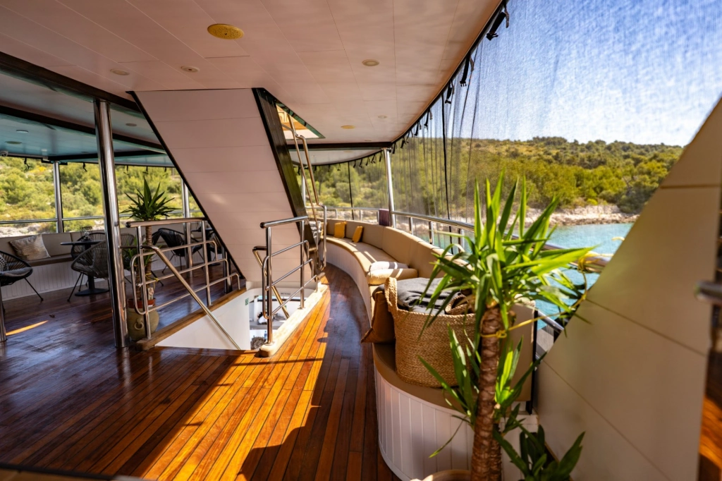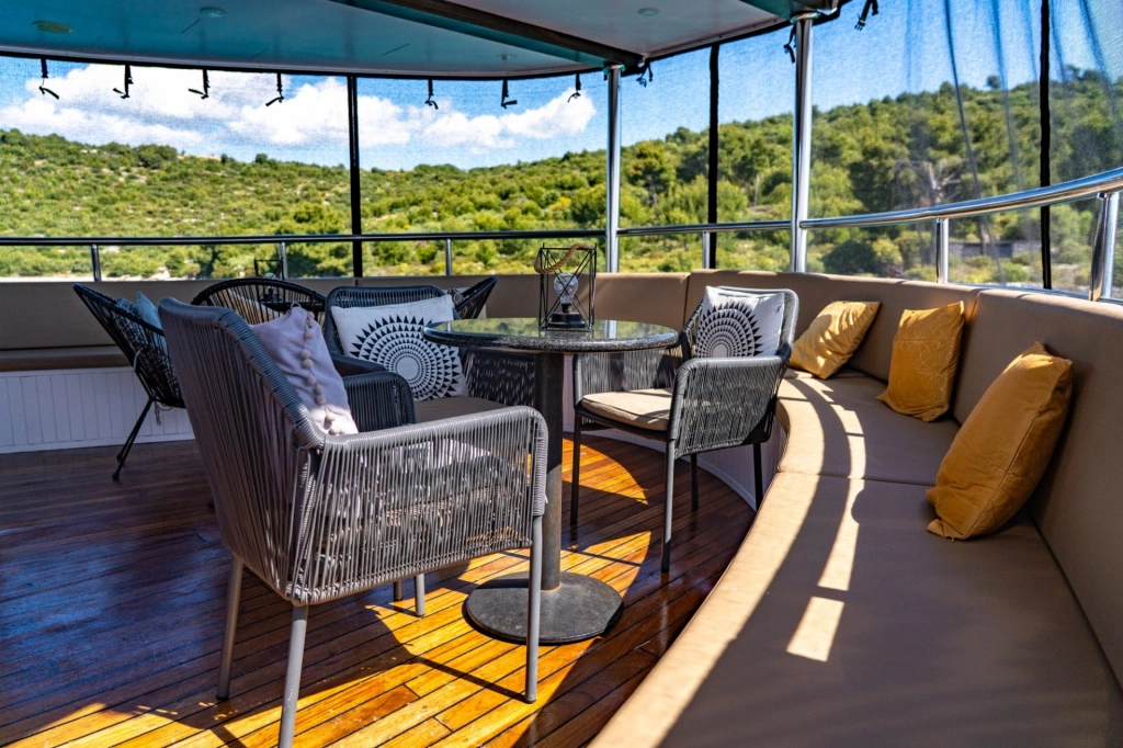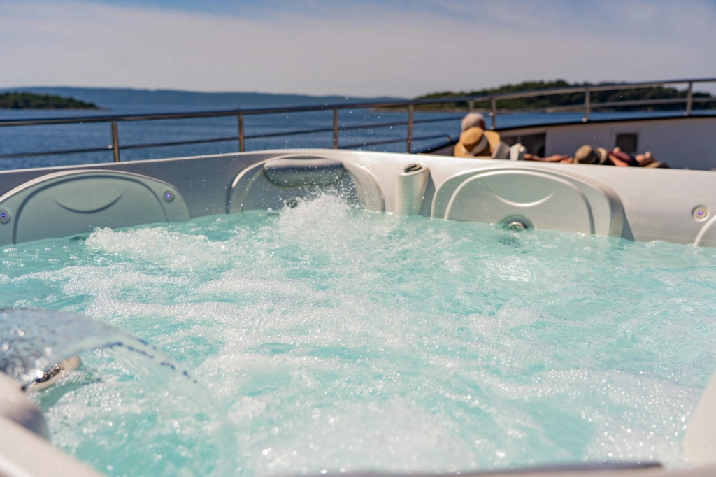 Für Momente purer Entspannung erwartet Sie unser weitläufiges Sonnendeck. Lehnen Sie sich in den komfortablen Sonnenstühlen zurück oder geniessen Sie ein Bad im Whirlpool (Hot Tub), während die spektakuläre Küstenlandschaft der Adria lautlos an Ihnen vorbeizieht.
