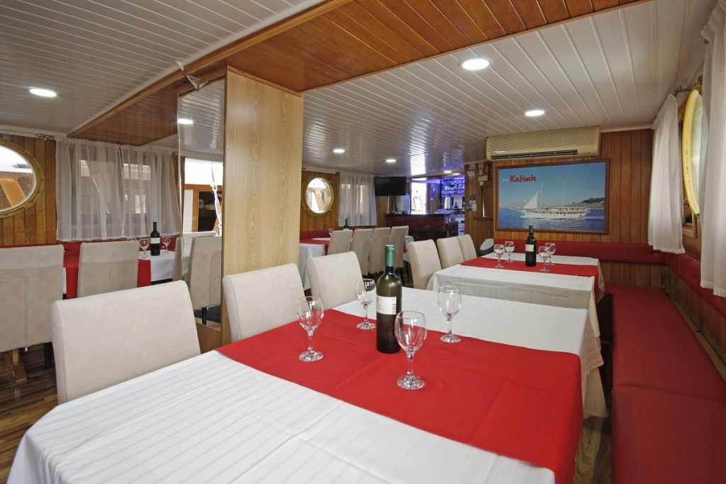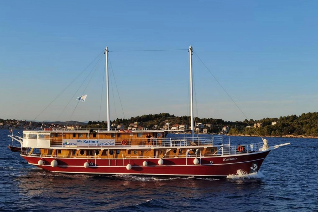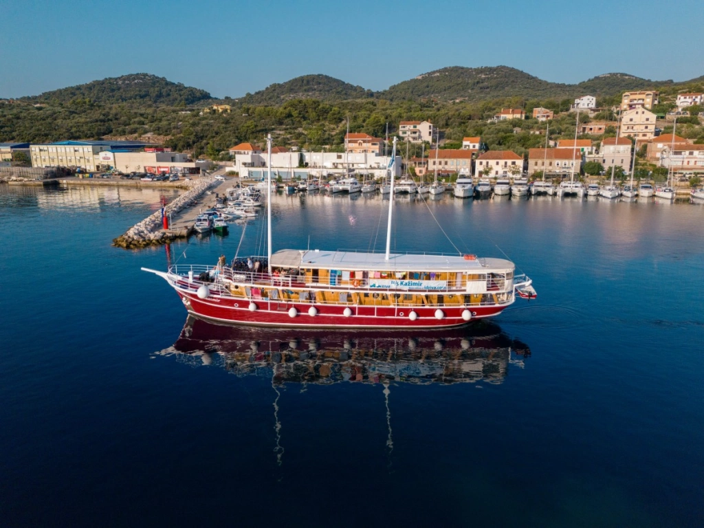 Ursprünglich im Jahre 1946 gebaut, wurden im Winter 1999/2000 sämtliche Aufbauten entfernt und der Rumpf komplett ausgehöhlt. Die Familie Šango aus Privlaka bei Zadar wollte nämlich einen vollkommen „neuen“ Motorsegler bauen. Fleiß und Mühe haben sich ausgezahlt, denn die Kažimir wurde damit nicht nur das seinerzeit größte Holzschiff unserer Flotte, sondern gleichzeitig auch das Erste, das ausschließlich über Kabinen an Deck verfügte. Kapitän Kaže genießt längst den wohlverdienten Ruhestand und hat das Kommando seinem Sohn Kažo (genannt Braco) übergeben, der die Kažimir nun zusammen mit seiner Frau Zdenka und seinem Sohn Renato führt. Die drei haben in den letzten Wintern viel Arbeit, Fleiß und Geld investiert, um das Schiff aufzufrischen. Jeder Gast, der bereits an Bord der Kažimir war, wird dies sofort bemerken – ob im Salon, in den Kabinen oder an Deck. Zur Saison 2020 wurde die Beplankung des gesamten Rumpfes erneuert – bei dieser Gelegenheit erhielt die Kažimir auch farblich ein neues Aussehen. Renato steht im Übrigen schon seit ein paar Jahren als Kapitän am Steuer.