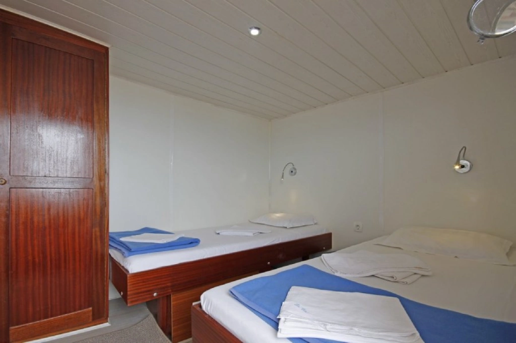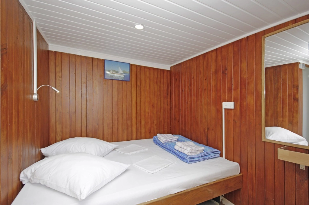 Hauptdeck: 2 Dreibettkabinen mit französischem Bett und 3. Bett darüber, 6 Doppelkabinen mit französischem Bett.