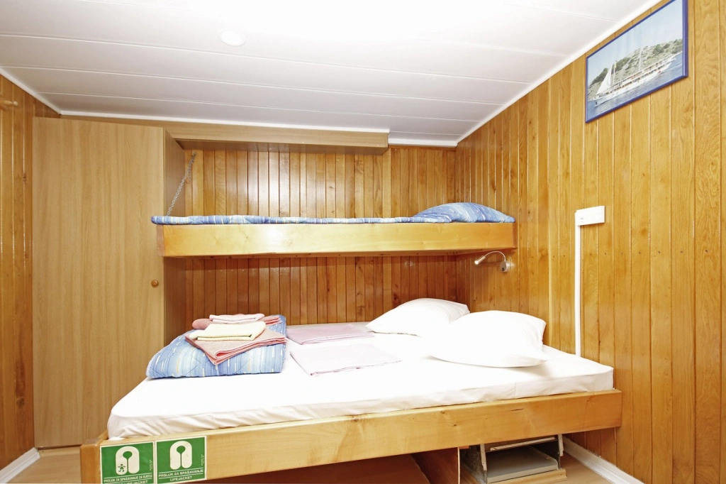 Oberdeck: 4 Doppelkabinen mit französischem Bett, 3 Doppelkabinen mit Etagenbetten.