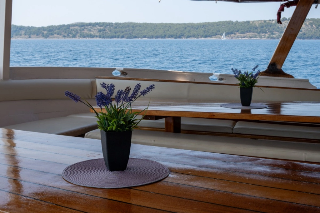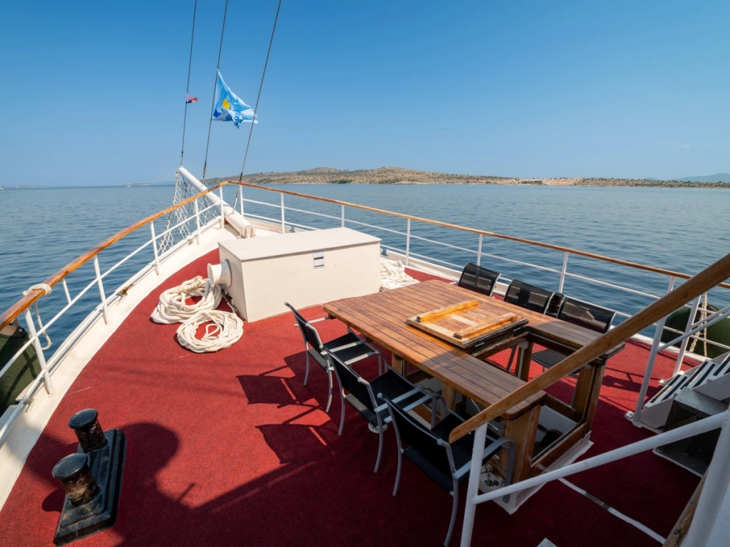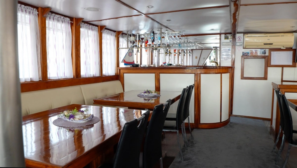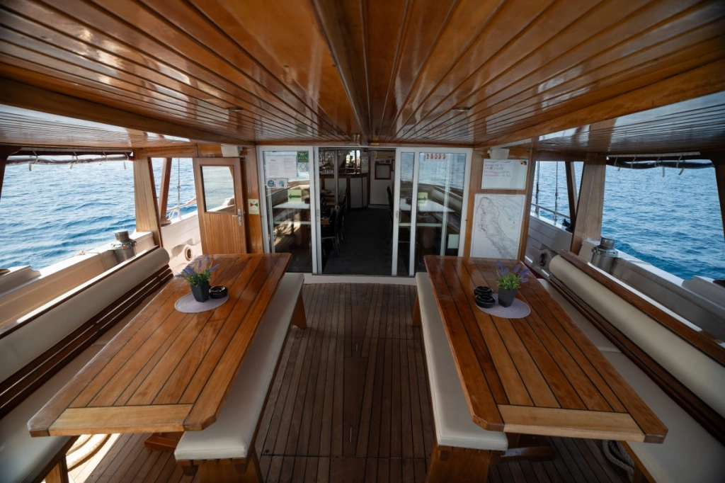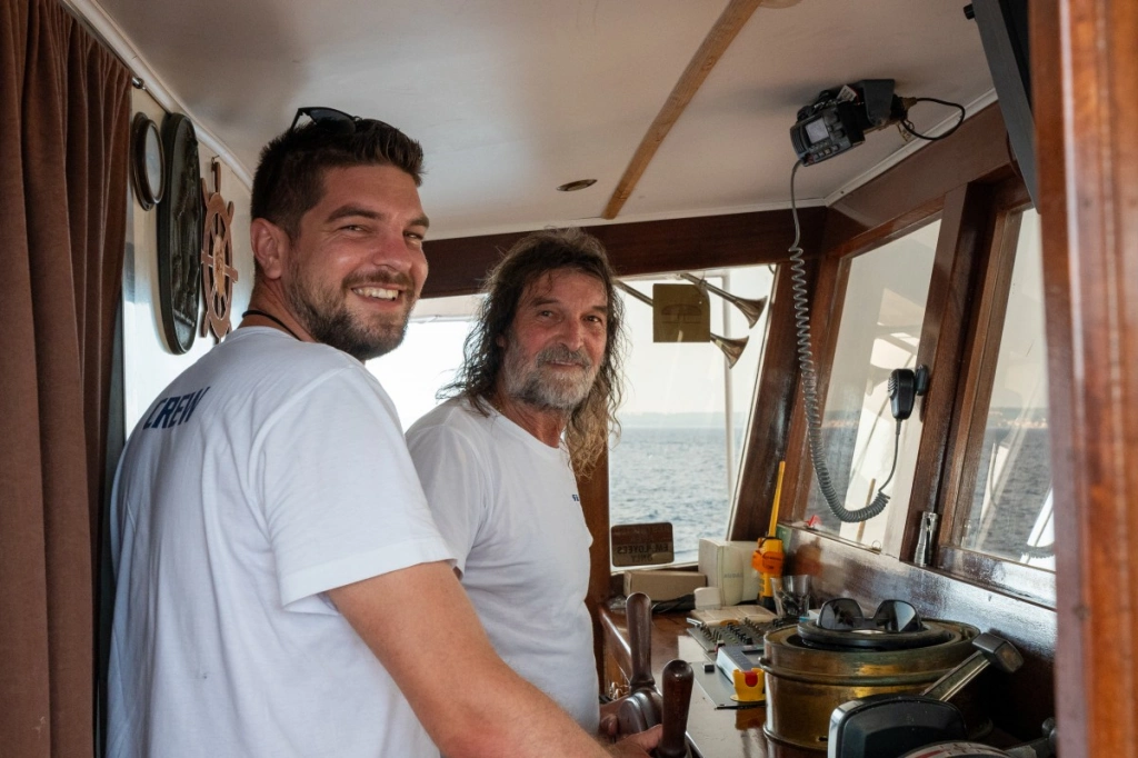 Der stolze und komfortable Dreimaster war viele Jahre lang fester Bestandteil unserer Flotte, bis sich ihre ehemaligen Besitzer vor ein paar Jahren entschlossen haben, eine andere Art von Kreuzfahrten zu veranstalten. Im Herbst 2016 haben sie die Sveti Vid dann verkauft – und zwar niemand geringerem als unserem langjährigen Kapitän Marin Mladin (genannt Čičak, zu Deutsch „Klette“, wegen seines Bartes) von der Otac Luka, deren Steuer er elf Jahre lang in der Hand gehalten hat. Čičak und sein Sohn Marin haben die Sveti Vid im Winter 2016/2017 ganz allein und ohne fremde Hilfe gründlich renoviert, unter anderem wurde der Salon vollkommen neu gestaltet. Bei der Dekoration des Salons hat natürlich auch seine Frau Nina ein wichtiges Wort mitgeredet, was auf den ersten Blick zu erkennen ist. Während Kapitän Čičak die Sveti Vid mit sicherer Hand durch die Adria steuert, kümmert sich sein Sohn Marin um das Wohl der Gäste und achtet darauf, dass an Bord alles in bester Ordnung ist.