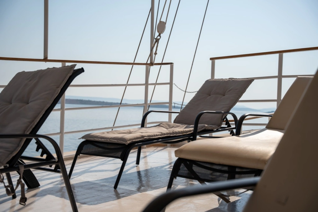Sonstiges: Sonnendeck (150 m²) mit 20 Liegestühlen, neuer Lounge-Bereich für 10 Personen auf dem Oberdeck vor dem Steuerhaus sowie am Heck des Oberdecks für 8 Personen, Stühle und Sitzbänke an Deck, Salon mit Klimaanlage für 32 Personen.