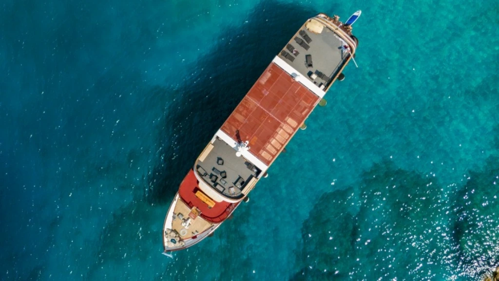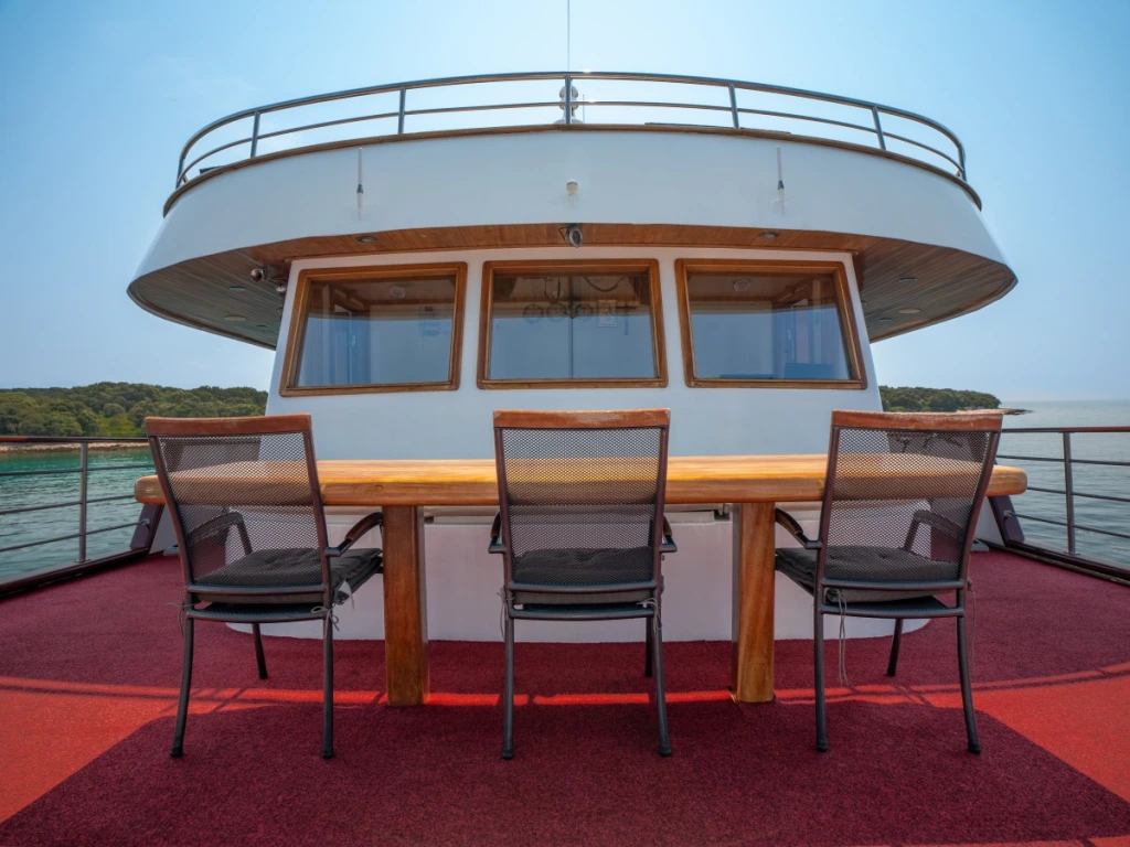 Sonstiges: Sonnendeck (200 m²) mit 30 Sonnenliegen und 10 Liegestühlen, Badeplattform mit Duschen am Heck. Salon mit Klimaanlage für 38 Personen auf dem Oberdeck, Tische mit Bänken und Stühlen für 38 Personen auf dem überdachten Oberdeck hinter dem Salon, das witterungsabhängig mit Planen verschlossen werden kann. Tägliche Kabinenreinigung und Handtuchwechsel.