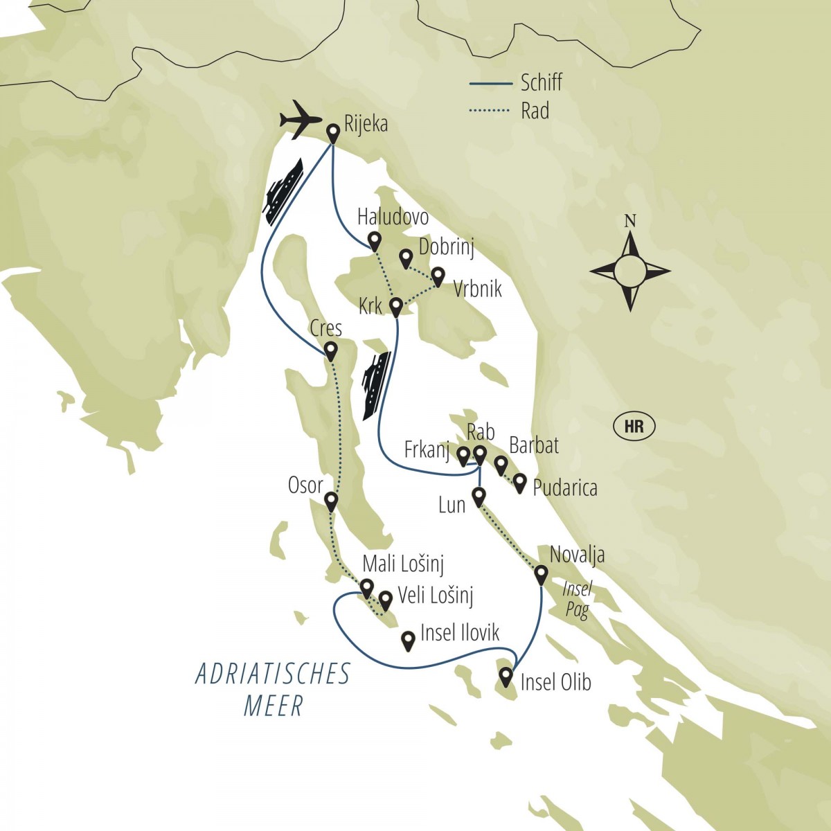 Route: Rijeka – Insel Krk – Insel Rab – Insel Pag – Inseln Olib oder Ilovik – Insel Lošinj – Insel Cres – Rijeka