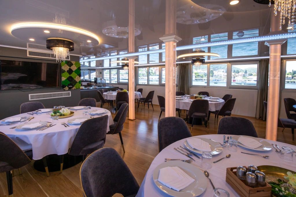 Restaurant & Bar: Ein klimatisierter Raum mit Panoramafenstern bietet den perfekten Rahmen für Ihre Mahlzeiten und Drinks.