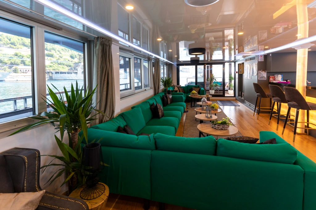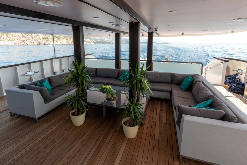 Schattiger Lounge-Bereich (Hauptdeck): Perfekt für geselliges Beisammensein, Entspannen und Verweilen.