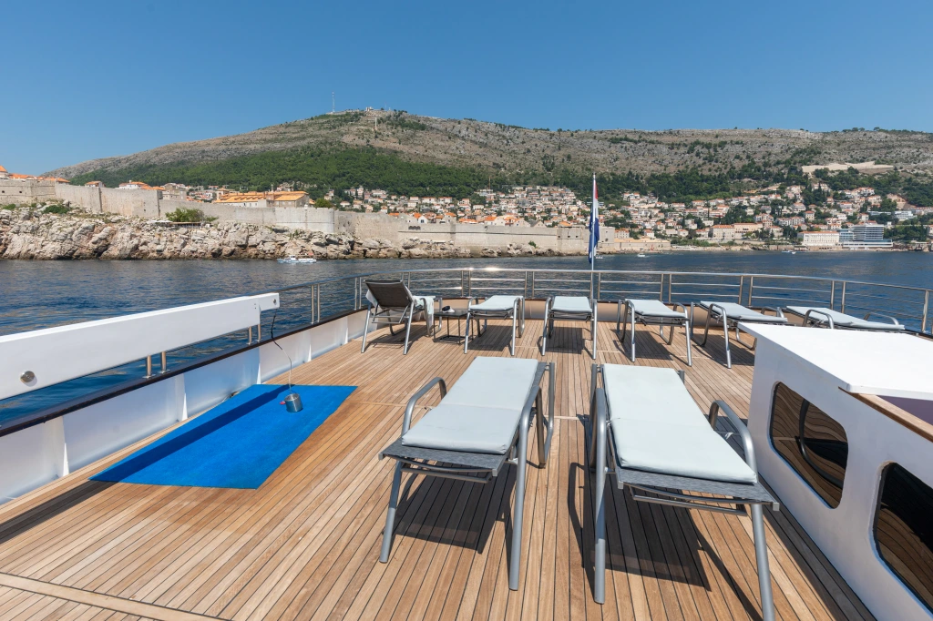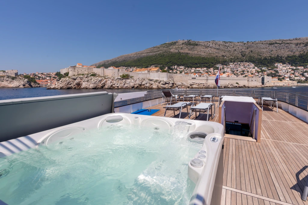 Sonnendeck: Entspannen Sie auf bequemen Liegestühlen oder im sprudelnden Jacuzzi und saugen Sie die atemberaubende kroatische Landschaft ein.