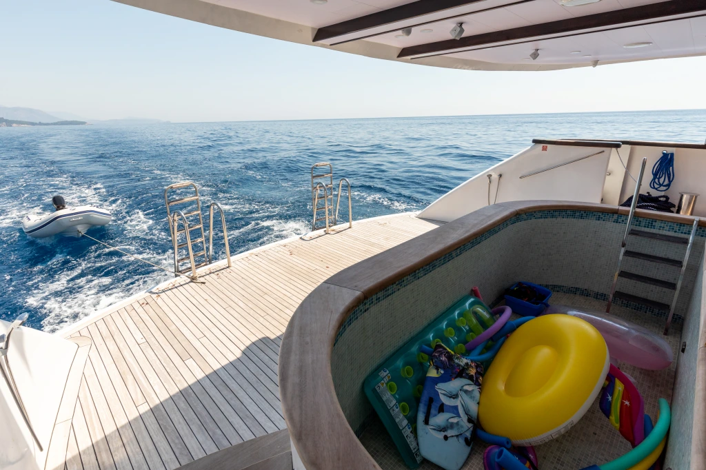 Im Heck des Hauptdecks erleichtert eine Badeplattform das Ein- und Aussteigen in das erfrischende Meer.